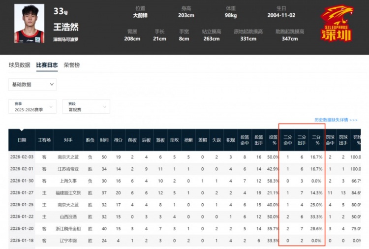 只看基础数据,蒋浩然是一个在CBA弱队里打替补场均不到10分,空间能力聊胜于无,篮板也很存疑的四号位。