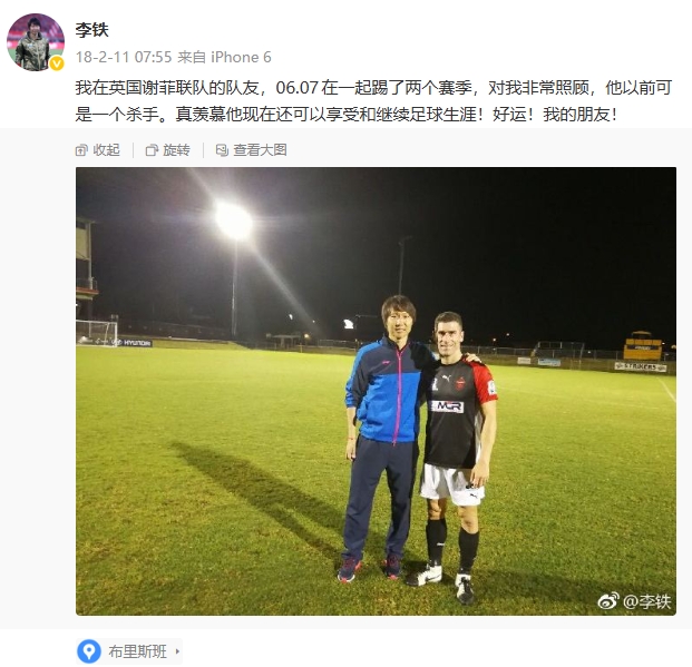 李铁在社媒晒出合照,他写道:“我在英国谢菲联队的队友,06.07在一起踢了两个赛季,对我非常照顾,他以前可是一个杀手。真羡慕他现在还可以享受和继续足球生涯!好运!我的朋友! ”