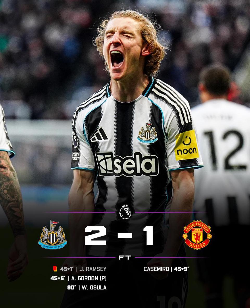 易边再战,曼联一度围攻对手,但是却始终无法再度破门,少打一人的喜鹊坚决打反击,第91分钟,特里皮尔送出精准长传,奥苏拉带球一路狂突内切兜射破门,纽卡2-1绝杀曼联,卡里克不败金身就此告破。